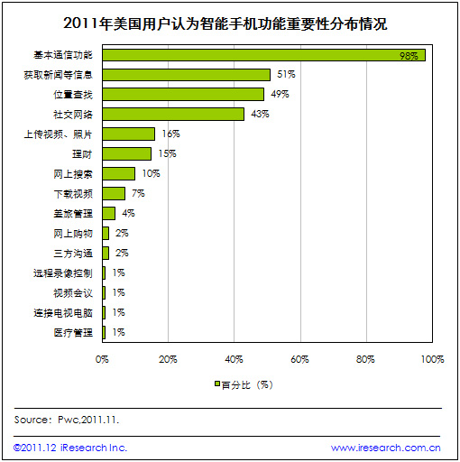 艾瑞咨詢根據(jù)Pwc近日發(fā)布的美國移動互聯(lián)網(wǎng)用戶演變研究報告發(fā)現(xiàn),用戶對移動設備的使用和依賴程度增強,同時,通過對用戶使用智能手機功能的調(diào)查發(fā)現(xiàn),用戶認為最重要的功能主要集中在基本通信、獲取資訊信息、位置查找和社交網(wǎng)絡上。