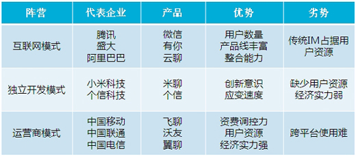 國(guó)內(nèi)移動(dòng)IM領(lǐng)域正式進(jìn)入群雄爭(zhēng)霸時(shí)代,并形成了移動(dòng)互聯(lián)網(wǎng)新興企業(yè)、互聯(lián)網(wǎng)巨頭、運(yùn)營(yíng)商三大陣營(yíng)。