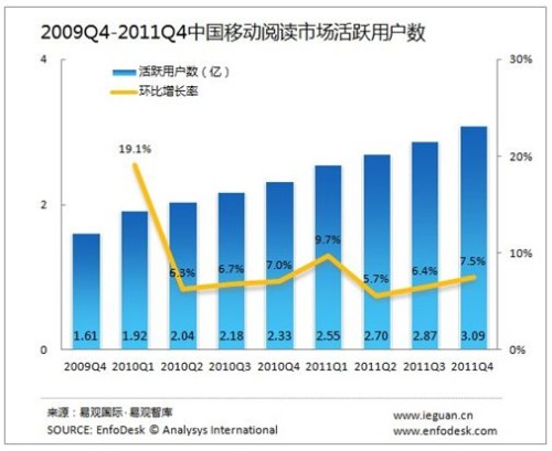 據(jù)EnfoDesk易觀智庫最新數(shù)據(jù)顯示,2011年第4季度中國手機(jī)閱讀市場(chǎng)活躍用戶數(shù)達(dá)3.09億,環(huán)比增長(zhǎng)7.46%,同比增長(zhǎng)33%。