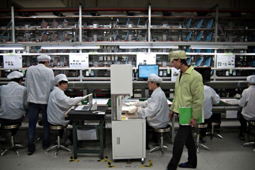 在富士康深圳觀瀾工廠,iPhone組裝線的工人在默默工作。