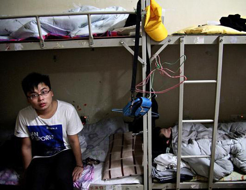 富士康一名員工從睡夢中醒來,而他的兩名同事仍在繼續(xù)睡覺。在富士康宿舍中,8名工人共用一個(gè)單間。