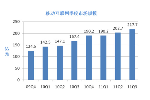 上圖是易觀國際發(fā)布的移動互聯(lián)網(wǎng)的相關(guān)數(shù)據(jù),數(shù)據(jù)截止到2011年第三季度,該圖顯示,2009年全球經(jīng)濟(jì)復(fù)蘇之后,移動互聯(lián)網(wǎng)業(yè)務(wù)收入一直保持著良好的增長狀態(tài),最新數(shù)據(jù)表明,2011年移動互聯(lián)網(wǎng)的整體市場規(guī)模已達(dá)到851億,遠(yuǎn)超過2010年的637億,增長率將近33.6%,在移動互聯(lián)網(wǎng)業(yè)務(wù)子領(lǐng)域中,表現(xiàn)最突出的是移動電子商務(wù),與2009年相比較,移動電子商務(wù)所占比例由3%直線增長到11%。但是在手機(jī)閱讀和手機(jī)游戲方面則表現(xiàn)平平,有較大的增長空間。預(yù)計2012年3G用戶規(guī)模將增長到6億,將會超過互聯(lián)網(wǎng)用戶數(shù)量,智能機(jī)以及移動互聯(lián)網(wǎng)還會保持或者超過2011年的增長速率。