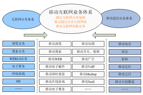 根據(jù)工信部相關(guān)信息,移動互聯(lián)網(wǎng)的業(yè)務(wù)體系主要包括三大類,如下圖所示:一是固定互聯(lián)網(wǎng)的業(yè)務(wù)向移動終端的復(fù)制,從而實現(xiàn)移動互聯(lián)網(wǎng)與固定互聯(lián)網(wǎng)相似的業(yè)務(wù)體驗,這是移動互聯(lián)網(wǎng)業(yè)務(wù)的基礎(chǔ)。二是移動通信業(yè)務(wù)的互聯(lián)網(wǎng)化,如Skype推出的移動VOIP業(yè)務(wù)、中國移動的飛信業(yè)務(wù)等。三是結(jié)合移動通信與互聯(lián)網(wǎng)功能而進(jìn)行的有別于固定互聯(lián)網(wǎng)的業(yè)務(wù)創(chuàng)新,這是移動互聯(lián)網(wǎng)業(yè)務(wù)發(fā)展方向。對創(chuàng)業(yè)者而言,移動互聯(lián)網(wǎng)的業(yè)務(wù)創(chuàng)新關(guān)鍵是如何將移動通信的網(wǎng)絡(luò)能力與互聯(lián)網(wǎng)的網(wǎng)絡(luò)與應(yīng)用能力進(jìn)行聚合,從而創(chuàng)新出適合移動終端的互聯(lián)網(wǎng)業(yè)務(wù),如移動Web2.0業(yè)務(wù),如微博、移動位置類互聯(lián)網(wǎng)業(yè)務(wù)等。