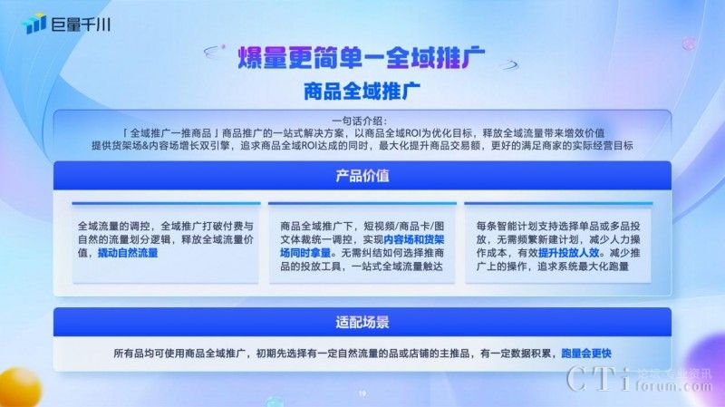 此外,商品全域推廣為商品推廣提供一站式解決方案,是以商品全域ROI為優(yōu)化目標(biāo),釋放全域流量帶來的增效價(jià)值,提供貨架場(chǎng)、內(nèi)容場(chǎng)增長(zhǎng)雙引擎,幫助客戶在追求商品全域ROI達(dá)成的同時(shí),最大化提升商品交易額,更好的滿足客戶的實(shí)際經(jīng)營(yíng)目標(biāo)。在商品全域推廣下,短視頻/商品卡/圖文體裁統(tǒng)一調(diào)控,無(wú)需糾結(jié)選擇推廣商品的投放工具,一站式全域流量觸達(dá)。