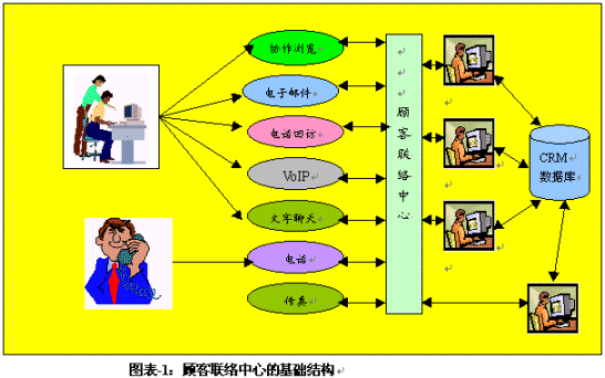 。。呼叫中心通過多年以來的發(fā)展,其傳統(tǒng)型的呼叫中心還是主要在以電話為媒介服務于顧客。這類呼叫中心的基礎結(jié)構(gòu)包括ACD、IVR、CTI等技術(shù)應用平臺和界面,同時與企業(yè)的后臺資源相連接,例如大型或相關(guān)數(shù)據(jù)庫。但是,當今的呼叫中心已經(jīng)發(fā)展成為一個多媒體的服務或交易渠道,有的還能處理基于互聯(lián)網(wǎng)的垂詢和呼叫,而有的則是一個虛擬的顧客聯(lián)絡中心,例如圖表-1中描述的那樣: