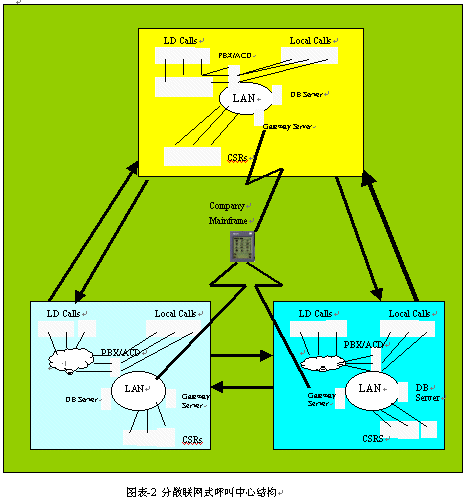 。。建立內(nèi)部專用網(wǎng)的目的是有效地實現(xiàn)各呼叫中心之間的同級來話路由,使來話的語音信息和數(shù)據(jù)信息能在各個呼叫中心之間流轉。通常情況下,這種形式的呼叫中心可以以一種預先確定的標準,有效地分配溢出的來話。這一類型的來話路由分配在虛擬呼叫中心中則沒有被考慮進去。