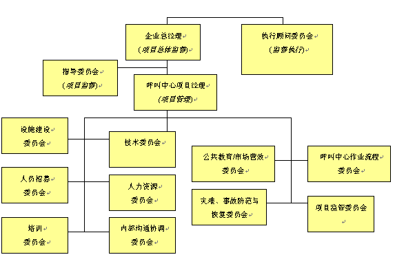 。。對(duì)于呼叫中心建設(shè)項(xiàng)目實(shí)施的規(guī)劃是一個(gè)需要付出巨大心血與努力的階段,這個(gè)階段需要企業(yè)或組織機(jī)構(gòu)所有人員的廣泛參與和專家意見。對(duì)于呼叫中心運(yùn)營(yíng)的規(guī)劃,相對(duì)與呼叫中心建設(shè)項(xiàng)目而言則顯得有些"特殊",它意味著整個(gè)呼叫中心建設(shè)項(xiàng)目團(tuán)隊(duì)不可能有全部的時(shí)間花費(fèi)在運(yùn)營(yíng)規(guī)劃議題上。因此,我們可以將全部項(xiàng)目規(guī)劃工作與任務(wù)拆分成若干個(gè)規(guī)劃細(xì)項(xiàng),這將保證有較強(qiáng)的可操作性。我們建議采取的方式是將整個(gè)項(xiàng)目實(shí)施規(guī)劃團(tuán)隊(duì)拆分成負(fù)責(zé)各個(gè)專項(xiàng)實(shí)施的小組委員會(huì)或附屬委員會(huì)。這些小組委員會(huì)將集中關(guān)注各自特定的項(xiàng)目實(shí)施上,當(dāng)有需要時(shí),與其他各小組進(jìn)行交流與溝通,并在相關(guān)問題上達(dá)成一致。按照以上項(xiàng)目組織管理架構(gòu)其目的是,在項(xiàng)目實(shí)施的關(guān)鍵環(huán)節(jié)和領(lǐng)域,能產(chǎn)生出更具深度的規(guī)劃方案。這樣操作同時(shí)可以使更多的人員參與進(jìn)來,并有利于增強(qiáng)各個(gè)小組的責(zé)任感,有助于項(xiàng)目的成功實(shí)施。以下的項(xiàng)目指導(dǎo)委員會(huì)組織架構(gòu)不是任何呼叫中心建設(shè)項(xiàng)目都能適用的,但是它在某種程度上已經(jīng)為呼叫中心項(xiàng)目規(guī)劃提出了一個(gè)基本方針,按照這個(gè)思路它將保證項(xiàng)目的成功實(shí)施。而對(duì)于規(guī)模較小的呼叫中心項(xiàng)目,以上的組織架構(gòu)成員將扮演多重角色,并負(fù)責(zé)多項(xiàng)任務(wù)項(xiàng)目的實(shí)施。就呼叫中心項(xiàng)目規(guī)劃與實(shí)施團(tuán)隊(duì)而言,應(yīng)由若干個(gè)負(fù)責(zé)不同領(lǐng)域?qū)嵤┑男〗M來組成,以便確保呼叫中心建設(shè)項(xiàng)目的所有領(lǐng)域,及各個(gè)階段的有效實(shí)施。呼叫中心項(xiàng)目規(guī)劃與實(shí)施組織架構(gòu)請(qǐng)見下圖。