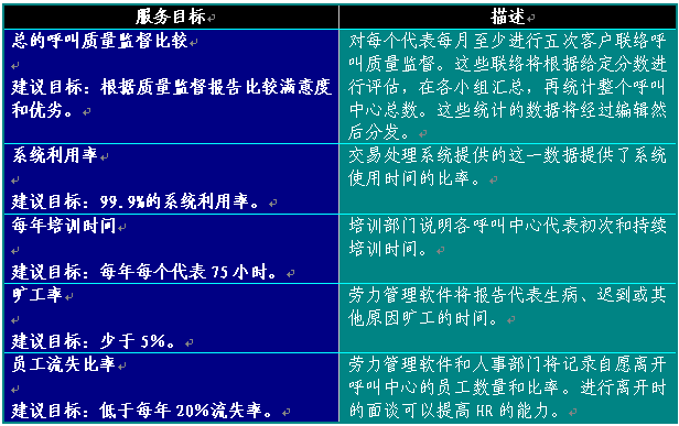 表格3中列出了一些日常工作評(píng)估標(biāo)準(zhǔn)。同時(shí)也提供了可以利用的最佳實(shí)踐目標(biāo)。隨著時(shí)間的持續(xù),呼叫中心也可以設(shè)定額外目標(biāo)評(píng)估運(yùn)營(yíng)工作。