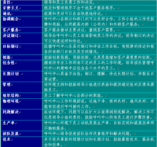 附錄6提供了建議的員工滿(mǎn)意度調(diào)查表?梢宰鳛闇(zhǔn)備制訂呼叫中心使用的版本的起點(diǎn)。在制訂表格時(shí),應(yīng)從所有中心最佳實(shí)踐工作和領(lǐng)導(dǎo)團(tuán)隊(duì)確認(rèn)的其他部門(mén)取得評(píng)估要素。表格6總結(jié)了呼叫中心員工滿(mǎn)意度調(diào)查應(yīng)包含的主要方面:
