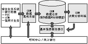 在CRM數(shù)據(jù)倉庫中,實(shí)際數(shù)據(jù)分為操作數(shù)據(jù)和分析模型。操作數(shù)據(jù)包括客戶基本信息、客戶賬務(wù)信息和操作控制(客戶個(gè)性化服務(wù)信息)。分析模型包括客戶關(guān)系管理的所有分析模型、市場分析、客戶信用度分析、客戶滿意度分析和銷售行為分析。因此,CRM的主體部分將通過數(shù)據(jù)集成系統(tǒng)與業(yè)務(wù)處理部分(綜合柜面系統(tǒng)等)和客戶聯(lián)系部分(呼叫中心等)連接起來。同時(shí),由于業(yè)務(wù)處理部分一般都采用銀行的現(xiàn)有系統(tǒng),而呼叫中心則可以成為一個(gè)相對獨(dú)立的模塊,因此,銀行CRM系統(tǒng)的實(shí)施主要體現(xiàn)在CRM數(shù)據(jù)集成系統(tǒng)、CRM數(shù)據(jù)倉庫、CRM決策分析環(huán)境、基本信息服務(wù)接口等四大部分。
