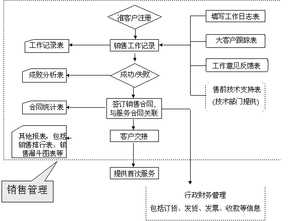 選定適合中小企業(yè)應(yīng)用的CRM軟件 ----啟利CRM ( ChineseCRM.Net ),并由啟利公司負(fù)責(zé)提供實施服務(wù)。CRM系統(tǒng)的主要模塊包括:市場管理、銷售管理、服務(wù)管理、行政管理,各模塊主要業(yè)務(wù)流程圖如下:
