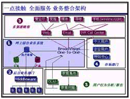 在“一對一模式”中,BroadVision公司可以為原有后臺系統(tǒng)提供有機的整合(如連接用戶的記費、業(yè)務、用戶數(shù)據(jù)系統(tǒng)),使其在前臺可提供多種用戶的接入手段,形成業(yè)務的完整流程,如通過多種接入手段提供查詢、咨詢、受理、投訴等業(yè)務;電信企業(yè)還可通過此平臺提供增值業(yè)務,如電子商務、信息服務、代繳費等。