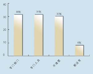 在問(wèn)到實(shí)施周期上,有9家表示希望在3個(gè)月內(nèi)完成,占到47.4%,有6家接受3~6個(gè)月的周期,超過(guò)6個(gè)月的周期已經(jīng)顯得太長(zhǎng)。在問(wèn)到CRM的實(shí)施效果上,有9家認(rèn)為對(duì)公司運(yùn)營(yíng)效率有很大提高,8家認(rèn)為作用一般,只有2家認(rèn)為沒(méi)有作用。表明基本上企業(yè)認(rèn)可CRM的作用。在問(wèn)到是否有專(zhuān)門(mén)人員負(fù)責(zé)CRM時(shí),有6家表示有專(zhuān)門(mén)部門(mén),有6家有專(zhuān)門(mén)人員,合計(jì)占62%,說(shuō)明企業(yè)非常重視CRM的應(yīng)用。