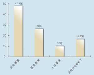 在問(wèn)到對(duì)CRM的熟悉程度方面,有12家表示熟悉,占到63.2%,另有7家表示不熟悉,說(shuō)明許多企業(yè)已經(jīng)對(duì)CRM有一定了解,不過(guò)也仍有相當(dāng)大的市場(chǎng)空間。其中有8家建立了CRM系統(tǒng),占到42%,計(jì)劃建立的有9家,占到47.4%,而有2家表示短期不會(huì)建立。從調(diào)查發(fā)現(xiàn),幾乎所有受訪(fǎng)者都接受和認(rèn)同CRM,盡管有一些企業(yè)還不熟悉,但在調(diào)查問(wèn)卷中對(duì)此表現(xiàn)出極大的興趣。在CRM的采購(gòu)動(dòng)機(jī)上,有9家表示是為了提高業(yè)務(wù),占到將近一半的比例(47.4%),而有5家表示出于企業(yè)宣傳,2家屬于上級(jí)主管部門(mén)要求,有3家表示是出于同行的示范。調(diào)查顯示,企業(yè)獲得CRM的信息來(lái)源很廣,最多的是通過(guò)報(bào)刊雜志的廣告,有6家,占31.6%,而上級(jí)推薦和供應(yīng)商推薦各有4家,各占21%,有兩家是集成商推薦,此外還有3家通過(guò)展會(huì)獲得相關(guān)信息。