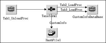 由于不同的源數(shù)據(jù)中可能包含同一個客戶的信息,因此采用Hashed File Stage HF_khjbxx存放輸出結(jié)果,相同客戶的信息根據(jù)客戶編碼覆蓋前面產(chǎn)生的信息,避免了重復(fù)的客戶信息。從不同源數(shù)據(jù)庫取得客戶信息,根據(jù)數(shù)據(jù)的真實性依次進(jìn)行處理后,生成的客戶信息全部保存在一個Hash文件中,最后從Hash文件中取出結(jié)果數(shù)據(jù)裝載到目標(biāo)數(shù)據(jù)庫中。