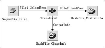 客戶信息數(shù)據(jù)庫中的各表以客戶編碼為關(guān)鍵字進(jìn)行關(guān)聯(lián),客戶編碼是由客戶的證件號碼經(jīng)過專門的算法計算產(chǎn)生的唯一客戶標(biāo)識。根據(jù)各個系統(tǒng)中客戶數(shù)據(jù)與新系統(tǒng)客戶信息的對照關(guān)系我們設(shè)計數(shù)據(jù)抽取轉(zhuǎn)換的程序,如圖4所示是一個DataStage的Job。