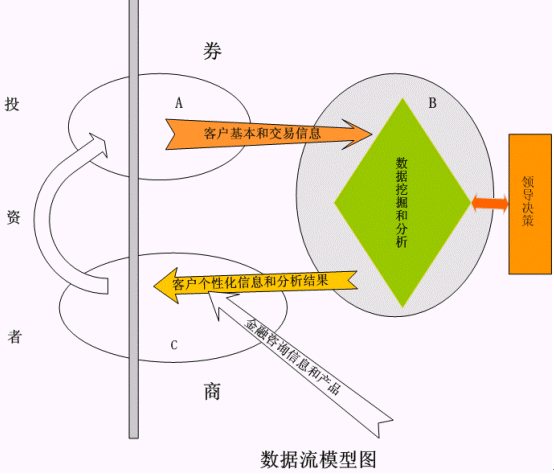 如數(shù)據(jù)流和服務(wù)模型圖所示,B模塊就是對客戶進(jìn)行數(shù)據(jù)分析和數(shù)據(jù)挖掘的模塊。這個(gè)模塊將會對領(lǐng)導(dǎo)決定支持和為下一步真正的為核心客戶提供更有針對行的服務(wù)提供基礎(chǔ)。