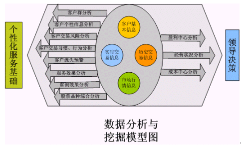 。。從上圖可以看出,在這個客戶信息數(shù)據(jù)分析模塊當中,主要分析對象是客戶的基本信息、客戶的實時交易信息、客戶的歷史交易信息、客戶帳戶信息和市場行情信息等幾個處于孤島形狀的信息模塊。而得到的分析結(jié)果應(yīng)該包括如下幾個基本方面,以被為領(lǐng)導(dǎo)的決策和企業(yè)的業(yè)務(wù)流程服務(wù):