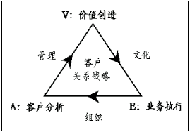 在全球CRM最佳實(shí)踐中有一種被稱作CRM"魔三角"的原理,備受企業(yè)的青睞。如下圖所示,構(gòu)成三角形三個頂點(diǎn)的,分別是"A"客戶分析、"V"價值創(chuàng)造和"E"業(yè)務(wù)執(zhí)行,它們反映客戶關(guān)系管理的全部內(nèi)容;構(gòu)成三角形三條邊的分別是"AV"管理、"VE"文化和"EA"組織,它們代表與客戶關(guān)系管理內(nèi)容相適應(yīng)的運(yùn)營環(huán)境及其方法。