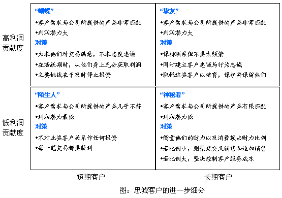 CRM廠商和業(yè)界普遍認(rèn)為:只要贏得了客戶的忠誠(chéng),企業(yè)將"財(cái)源滾滾";因此企業(yè)在培養(yǎng)客戶忠誠(chéng)方面的開支在逐步上升。因?yàn)閺谋砻嫔峡磥?lái),客戶滿意度、客戶忠誠(chéng)度和客戶保留度越高,客戶利潤(rùn)貢獻(xiàn)度就大。但事實(shí)并不如他們所愿,《哈佛商業(yè)評(píng)論》最新的論文,研究表明:客戶滿意度、客戶忠誠(chéng)度與客戶利潤(rùn)貢獻(xiàn)度的關(guān)聯(lián)程度比預(yù)期的要小得多。企業(yè)應(yīng)當(dāng)對(duì)忠誠(chéng)客戶再進(jìn)行細(xì)分,然后在更細(xì)化的客戶基礎(chǔ)上對(duì)其進(jìn)行分類管理,并采取相應(yīng)的對(duì)策。在論文中,作者根據(jù)利潤(rùn)貢獻(xiàn)度大小與客戶的短長(zhǎng)期兩個(gè)維度,將忠誠(chéng)客戶進(jìn)行了深層次細(xì)分。主要分成四類:"蝴蝶"、"摯友"、"陌生人"、"神秘者"。企業(yè)應(yīng)該根據(jù)每一類的情況采取相應(yīng)的對(duì)策。管理那些能使企業(yè)盈利但不忠誠(chéng)的客戶--"蝴蝶"--的關(guān)鍵是,在他們購(gòu)物時(shí)盡可能地從他們身上獲利。對(duì)那些既能帶來(lái)利潤(rùn)又忠誠(chéng)的客戶--"摯友",細(xì)心呵護(hù)他們則更為恰當(dāng)。至于那些忠誠(chéng)但不能帶來(lái)利潤(rùn)的客戶--"藤壺",你需要做的是確定他們是否有增加消費(fèi)的潛力。最后,對(duì)于"陌生人"--那些既不忠誠(chéng)又沒(méi)有利潤(rùn)可賺的客戶,答案當(dāng)然很簡(jiǎn)單:早點(diǎn)認(rèn)出他們,不對(duì)他們做任何投資。