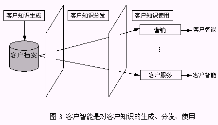 客戶知識是人們通過實踐認(rèn)識到的、與客戶有關(guān)的規(guī)律性,而客戶智能是獲得客戶知識并使用客戶知識求解問題的能力。客戶智能是對企業(yè)戰(zhàn)略決策真正有價值的事物和行動。客戶智能不僅包括了客戶知識的生成,而且更強調(diào)了客戶知識在企業(yè)中的分發(fā)、使用,直到產(chǎn)生客戶智能。所以,客戶智能是對客戶知識的生成、分發(fā)和使用(圖3)。