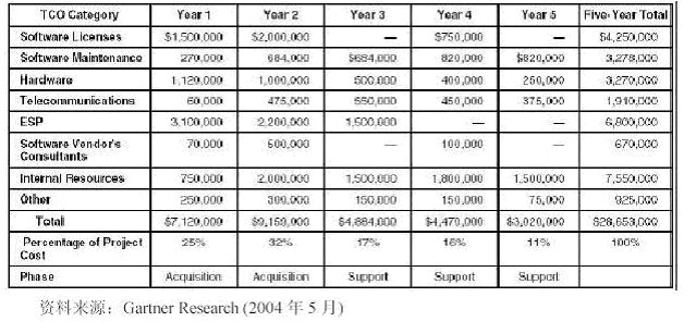 計算CRM 方面的TCO 是一件復雜的事情,它涉及到整體評估與包括一切的成本匯總,其中包括資本投資、許可證與維護費、直接的與間接的勞動力費用、培訓費、以及旅行與開銷(T&E)等,在CRM 方案的整個有效周期內(nèi)都會產(chǎn)生這些費用,它包括在企業(yè)內(nèi)部任何一個地方(銷售、營銷與服務方面)所產(chǎn)生的成本,以及該方案的IT 與技術組件方面的成本等,應該算入該項目或該方案每個階段期間的成本(例如規(guī)劃與采購、配置與管理、以及持續(xù)支持等)。