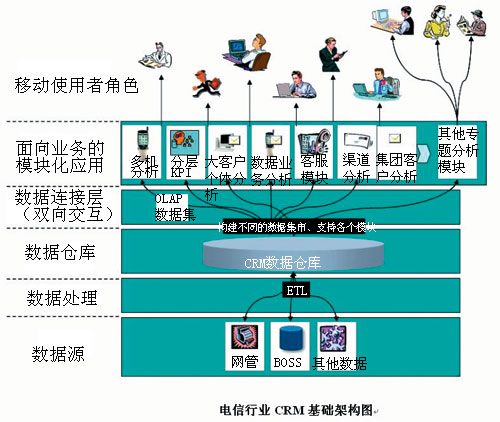 電信行業(yè)早期的CRM系統(tǒng)主要是由單一的多維分析子系統(tǒng)組成,比如移動總公司最早的CRM系統(tǒng)就僅僅規(guī)范了以多維分析為標準的九大主題分析。隨著移動電信市場的迅速增長,復(fù)雜程度越來越高,更多的子系統(tǒng)被添加進來,IT系統(tǒng)建設(shè)中模塊化的思路通過數(shù)據(jù)集市的方式在CRM建設(shè)中體現(xiàn)明顯。