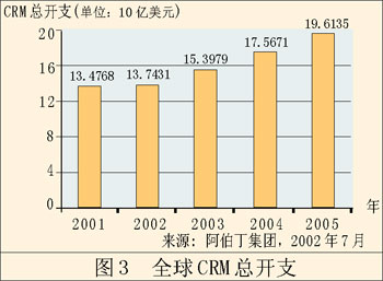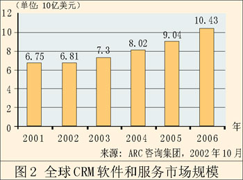 單單這還不是惟一能夠說明問題的。早在2002年,F(xiàn)orrester研究公司就聲稱,來自CRM的收入將從428億美元增長到738億美元。AMR研究公司同樣預(yù)測,這個領(lǐng)域會不斷增長。AMR的調(diào)查表明,91%的公司會在這方面增加開支,預(yù)計(jì)總開支會增長8%。值得一提的是,AMR所指的這一塊市場是“客戶管理”,而不是較為傳統(tǒng)的CRM,這說明CRM應(yīng)用軟件的作用發(fā)生了轉(zhuǎn)變。