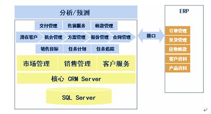 如下圖所示,明基逐鹿微軟CRM制造業(yè)解決方案在微軟CRM 3.0 市場管理,銷售管理,客戶服務管理三個功能模塊上,針對制造型企業(yè)的業(yè)務模式和特點定制了方案管理,報價管理,交付管理等多個增值功能,同時實現(xiàn)和ERP的接口。