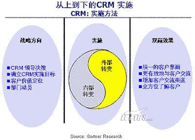 良好的CRM實施方法是從上到下的。也就是說,在企業(yè)內(nèi)部的高層支持和直接參與下,實施小組制定出CRM目標、客戶價值分類的依據(jù),并動員相關(guān)部門為整個項目投入精力和資源,實現(xiàn)內(nèi)部和外部的轉(zhuǎn)變,最后才能達到客戶和企業(yè)的雙贏效果。整個過程如下圖所示: