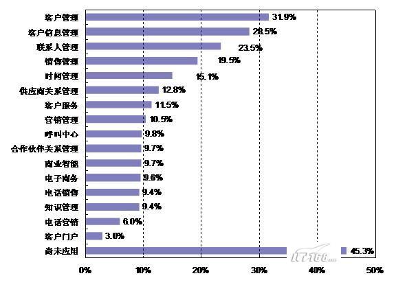 。。調(diào)查顯示,2007年有45.3%的企業(yè)還未應(yīng)用CRM信息化系統(tǒng)。在已經(jīng)應(yīng)用該系統(tǒng)的企業(yè)中,CRM系統(tǒng)應(yīng)用主要就是客戶(hù)管理,占到31.9%;其次是客戶(hù)信息管理和聯(lián)系人管理,這些應(yīng)用比例集中在23~31%之間;其他應(yīng)用還有銷(xiāo)售管理(19.5%)、時(shí)間管理(15.1%)、供應(yīng)商關(guān)系管理(12.8%)、客戶(hù)服務(wù)(11.5%)和營(yíng)銷(xiāo)管理(10.5%)等,呼叫中心、合作伙伴關(guān)系管理、商業(yè)智能、電子商務(wù)、電話銷(xiāo)售、知識(shí)管理、電話營(yíng)銷(xiāo)等比例均在10%以下。