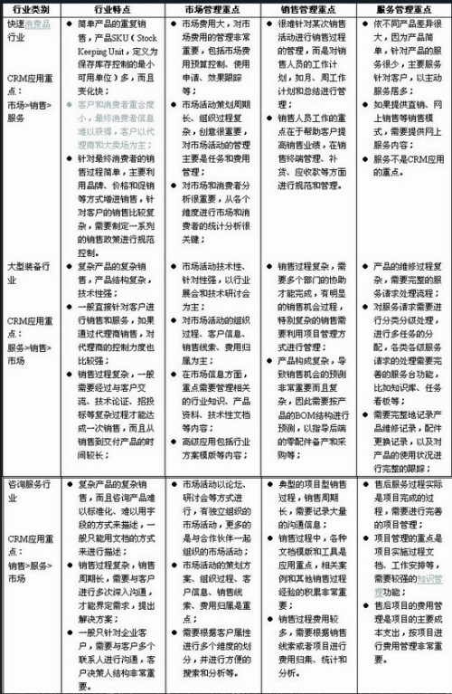 從以上簡(jiǎn)單的分析過(guò)程我們可以看出由于企業(yè)所處行業(yè)特點(diǎn)的不同,導(dǎo)致在市場(chǎng)、銷(xiāo)售和服務(wù)方面對(duì)CRM主要功能需求差別非常大。企業(yè)在實(shí)際選型過(guò)程中,還需要對(duì)行業(yè)再進(jìn)行細(xì)分分析,比如在快速消費(fèi)品中,洗滌用品行業(yè)和牛奶乳業(yè)行業(yè)在客戶(hù)服務(wù)的主要需求等方面就有比較大的差別,這些都需要細(xì)致的分析。