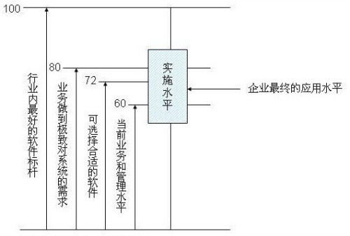 如果用一個(gè)數(shù)量化的概念來(lái)表達(dá)的話(huà),假定行業(yè)內(nèi)最好的軟件是100分,企業(yè)做到極致對(duì)系統(tǒng)的需求可能是80分,當(dāng)然也可能沒(méi)有一個(gè)軟件能滿(mǎn)足企業(yè)所有的需求,但從整體上,一個(gè)企業(yè)的主體需求一定在行業(yè)內(nèi)最好的軟件標(biāo)桿之下。而當(dāng)前的業(yè)務(wù)和管理水平一般到不了極致,假設(shè)是60分,那選擇的軟件70-75分一定是合適的,高于當(dāng)前需求,而不要高得太多,最終的實(shí)施水平是一個(gè)區(qū)間,這取決于實(shí)施商的能力和企業(yè)的能力,可能會(huì)低于企業(yè)當(dāng)前業(yè)務(wù)和管理水平,也可能使系統(tǒng)超水平發(fā)揮,而企業(yè)最終的應(yīng)用水平一般就在這個(gè)區(qū)間里游動(dòng)了。這個(gè)模型看起來(lái)很理論化,操作時(shí)需要考慮很多的因素,但是非常有價(jià)值的判斷標(biāo)準(zhǔn)。