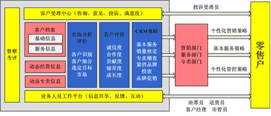 煙草行業(yè)的CRM項(xiàng)目是建立在煙草行業(yè)獨(dú)特的業(yè)務(wù)流程和特點(diǎn)之上的。在煙草行業(yè),CRM系統(tǒng)往往并不是作為一個獨(dú)立的系統(tǒng)存在,而是要與營銷系統(tǒng)、專賣系統(tǒng)等緊密聯(lián)系,形成相互共享資源的一個整體。因此,煙草行業(yè)CRM業(yè)務(wù)模型(如圖)要根據(jù)企業(yè)的經(jīng)營目標(biāo)、任務(wù)、市場管理的工作需要,為營銷、服務(wù)和專賣等部門制定營銷策略、服務(wù)策略和管控策略。