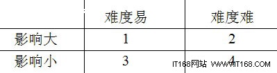 在實(shí)際工作中,筆者一般都會將用戶的需求進(jìn)行分類。如下圖所示,筆者會按兩個角度對需求進(jìn)行歸類,分別按難度與影響程度進(jìn)行區(qū)分。如根據(jù)難度可以將需求分為容易實(shí)現(xiàn)和實(shí)現(xiàn)起來比較困難兩個級別。而根據(jù)影響程度可以將需求分為影響大和影響小兩類。
