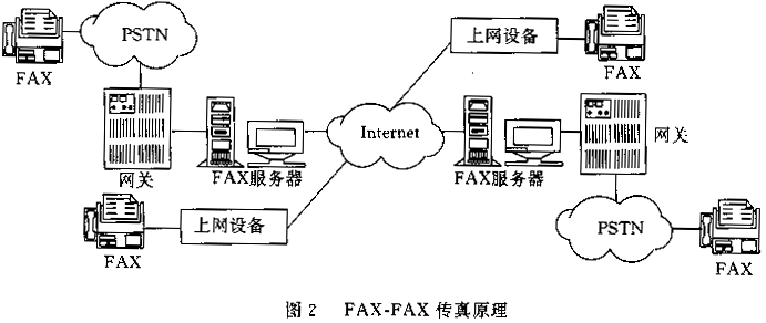 發(fā)送端傳真機與網(wǎng)關(guān)連接,通過PSTN傳送傳真,網(wǎng)關(guān)接收傳真后通過Internet傳至另一端的網(wǎng)關(guān),另一端的網(wǎng)關(guān)再通過PSTN將傳真發(fā)送給接收端傳真機。這種方式既適合存儲轉(zhuǎn)發(fā)模式,也適合實時模式,因此更加有吸引力。近年來,出現(xiàn)了一種不依賴網(wǎng)關(guān)的FAX-FAX IP傳真技術(shù),它是利用傳真機外掛一專用上網(wǎng)設備直接在Internet網(wǎng)上發(fā)送信息,原理如圖2所示。