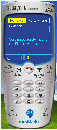 。ㄈ鐖D3),這個(gè)就是BuddyTalk的軟件界面。這象不象一個(gè)手機(jī)?上面的藍(lán)色部分是液晶屏。你可以選擇pc-to-pc或者pc-to-phone,下面是用來輸入電話號(hào)碼的一個(gè)空框,空框下面的部分是軟件顯示提示信息的,再下面是音量大小的顯示器。液晶屏的下面部分跟手機(jī)幾乎一樣,其中一個(gè)“search”,這是用來上網(wǎng)實(shí)現(xiàn)全球用戶數(shù)據(jù)庫(kù)搜索,一個(gè)“options”,各種設(shè)置可以在這里完成,“Memory”記錄的是你通話信息,以利快速撥號(hào)。