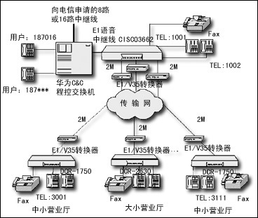 市聯(lián)通通過(guò)在Cisco 3662路由器上配置一個(gè)NM-HDV-1E1-30E語(yǔ)音中繼模塊,通過(guò)75歐姆同軸電纜與華為程控交換機(jī)的E1接口板相連,提供30路話音,該路由器用作語(yǔ)音網(wǎng)關(guān)。各網(wǎng)點(diǎn)配置神州數(shù)碼路由器,配置MR-VIC-2FXS或MR-NM-4FXS語(yǔ)音模塊,提供多路語(yǔ)音。