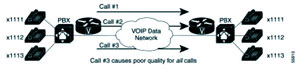 網(wǎng)絡(luò)中,話音網(wǎng)關(guān)路由器并不了解網(wǎng)絡(luò)中的狀況,包括:網(wǎng)絡(luò)的鏈路資源是否已經(jīng)飽和及網(wǎng)絡(luò)延遲,丟包率和網(wǎng)絡(luò)抖動(dòng)等參數(shù)是否可以滿(mǎn)足話音應(yīng)用的需求。如果在不能夠保證網(wǎng)絡(luò)可以提供足夠的資源保證話音質(zhì)量的情況下,建立新的通話鏈路可能影響已經(jīng)建立的鏈路,或者是降低所有的通話話音質(zhì)量。如圖三,如果廣域網(wǎng)的帶寬只能容納兩個(gè)語(yǔ)音的呼叫,第三個(gè)呼叫的建立會(huì)導(dǎo)致所有的呼叫質(zhì)量下降。在這種情況下,拒絕呼叫的建立好過(guò)建立一條沒(méi)有質(zhì)量保證的鏈路。