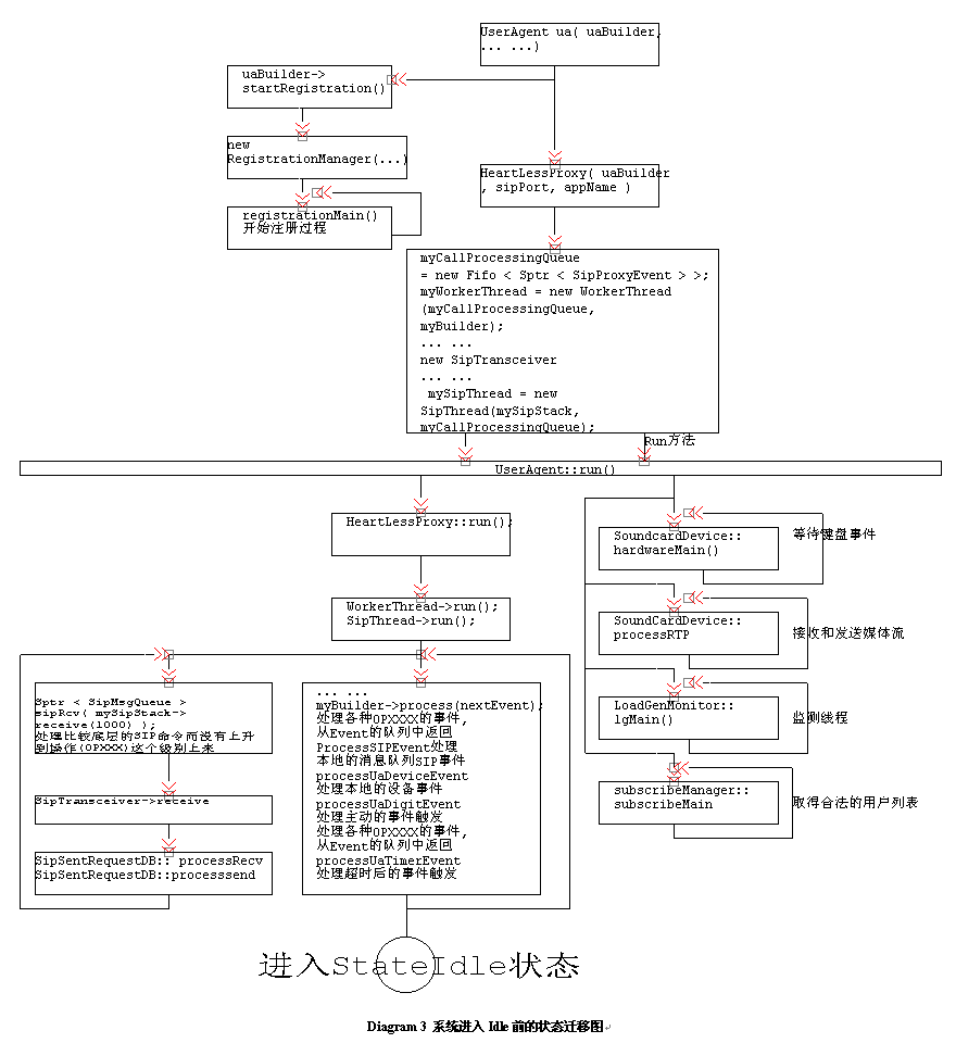 構(gòu)建User Agent的工作已經(jīng)完畢,現(xiàn)在應該讓調(diào)用它的Run方法了;從下面的程序可以看到,Run方法的調(diào)用,讓整個程序進入一種"Idle"的狀態(tài),等待命令輸入和狀態(tài)的產(chǎn)生,這個過程我們可以看到在Ua.CXX的Main程序中調(diào)用(ua.run())。