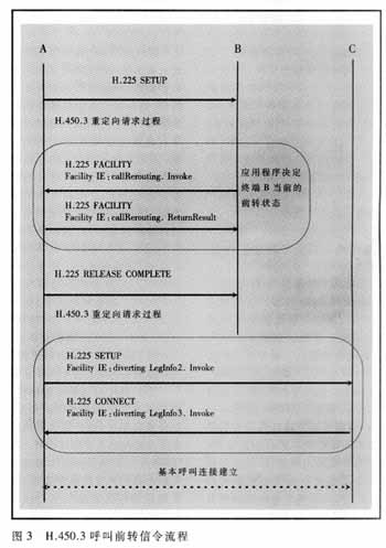圖3顯示了可編程呼叫前轉(zhuǎn)的信令流程,在終端B的控制下通過(guò)把呼叫重新定向到一個(gè)新的目的地址而實(shí)現(xiàn)呼叫前轉(zhuǎn)。終端B在接收到SETUP消息后,發(fā)送一個(gè)包含前轉(zhuǎn)目的終端C地址的信令消息到呼叫發(fā)起終端A。然后終端A直接建立到終端C的連接,同時(shí)向終端C指明該業(yè)務(wù)的性質(zhì)和相應(yīng)信息。
