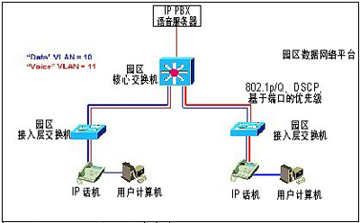 目前各個廠商的系列IP話機均提供2個以太網(wǎng)端口,一個連接網(wǎng)絡(luò)交換機,一個可以連接用戶PC,與網(wǎng)絡(luò)交換機連接端口支持802.1Q/p,可以實現(xiàn)IP語音和用戶PC劃歸不同的VLAN,而且IP語音包會帶上第二層和第三層的優(yōu)先級標記,可以和客戶具有QoS支持的數(shù)據(jù)網(wǎng)絡(luò)平臺結(jié)合,提高IP話音質(zhì)量。