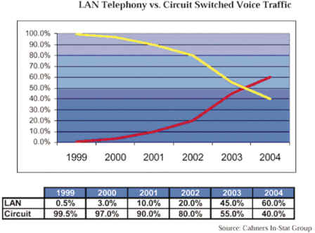 Group的資料顯示,LAN Telephone與Circuit Switched Voice Traffic比較圖,呈現(xiàn)數(shù)據(jù)網(wǎng)絡(luò)的占有率將在二至三年后,首度超越語音網(wǎng)絡(luò)的流量占有率。因此,不論是盤據(jù)傳統(tǒng)電信市場大廠如Lucent及Nortel,或是代表網(wǎng)絡(luò)新興勢力的Cisco,也都在積極爭搶這塊新領(lǐng)域的主導(dǎo)權(quán)。于是,有人說,「IP