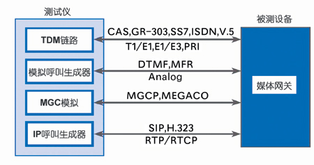 我們按照VoIP組網(wǎng)的原理,構(gòu)建了這樣一個基本網(wǎng)絡(luò),其網(wǎng)絡(luò)結(jié)構(gòu)如圖4所示。我們用軟交換的概念來描述網(wǎng)絡(luò)上的設(shè)備,在這個網(wǎng)絡(luò)上,MG(媒體網(wǎng)關(guān))和MGC(媒體網(wǎng)關(guān)控制器)是關(guān)鍵的VoIP網(wǎng)絡(luò)元素。這些網(wǎng)絡(luò)元素可以是支持H.323、MGCP、H.248或者SIP的實體。本文中提到的MG和MGC不具體指某一個設(shè)備,本次測試正是針對這兩類設(shè)備進(jìn)行,測試的主要內(nèi)容也圍繞著這兩類設(shè)備展開。測試從模擬話音開始,然后延伸到PSTN網(wǎng)絡(luò),再到IP網(wǎng)絡(luò),最后回到模擬話機(jī)的被叫方。在這樣一個完整通話過程中,測試MG以及MGC的信令互操作性以及設(shè)備處理信令的能力。圖5是測試系統(tǒng)結(jié)構(gòu)原理圖。