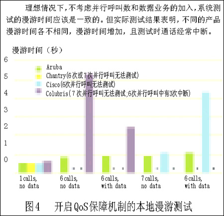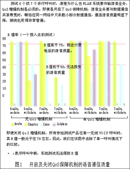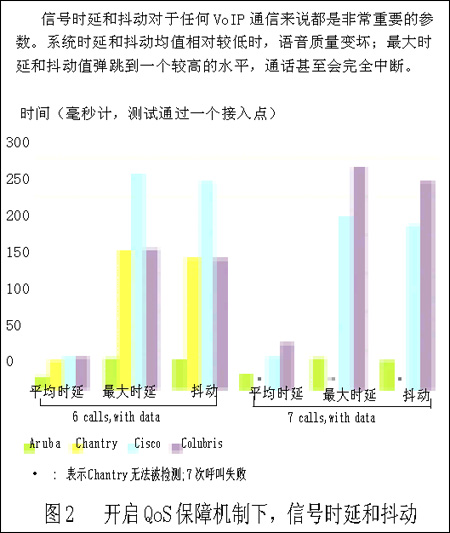 上述操作是為了啟動QoS保障機制后,系統(tǒng)就能取得顯著的成效。但只有Aruba的系統(tǒng)在所有測試中保持了一貫的良好表現(xiàn),在具有QoS保障機制的情況下,甚至在最惡劣的情況下(7個并行VoIP呼叫并加入數(shù)據(jù)流業(yè)務),它仍然能夠傳送出和付費電話通話質量一樣的信號。Aruba的系統(tǒng)在打開QoS增強機制的情況下,系統(tǒng)承載業(yè)務最空閑和最繁忙的測試結果差別很小。