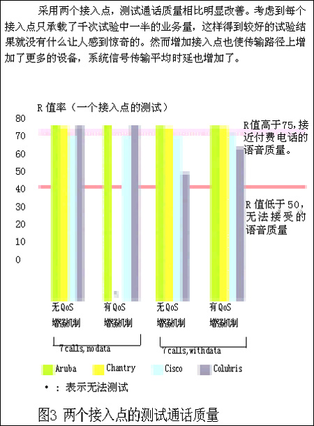 而其他供應商的設備在開啟QoS保障機制的情況下,一旦加入數(shù)據(jù)流業(yè)務,就很難保證通話質量。從正面來看,在只有語音傳輸業(yè)務的情況下,QoS保障機制一般運行較好。當我們只承載語音傳輸時,所有系統(tǒng)的音頻質量都改善了。在不加入數(shù)據(jù)流情況下測試6個或7個并行VoIP呼叫,所有的系統(tǒng)都能夠取得和付費電話一樣的通話質量。但當我們加入數(shù)據(jù)流業(yè)務,一切都改變了。在承載6個并行VoIP呼叫并加入數(shù)據(jù)流業(yè)務的情況下,Colubris CN1250系統(tǒng)的R值衰落到70以下。根據(jù)ITU的R值標準,這說明一些用戶的通話質量不令人滿意。Chanrty的R值在60左右,這個結果將不能令用戶滿意。除了客觀的R值評分以外,我們還進行了一些主觀的通信質量監(jiān)聽,當加入了數(shù)據(jù)流業(yè)務以后,我們聽到了大量的回聲,掉線頻繁?傊灰獪y試點加入數(shù)據(jù)業(yè)務流,上面描述的情況就會出現(xiàn),通話質量通常變得惡劣。
