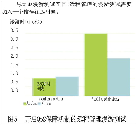 在沒有數(shù)據(jù)流業(yè)務接入時,兩個供應商的當?shù)睾瓦h程管理漫游時間是完全相同的(如圖5所示)。根據(jù)目前的數(shù)據(jù)來看,Aruba’s的本地漫游時間是1秒,而遠距離的地方漫游時間大約是3.5秒。而Cisco的設備在本地漫游的時間比長途漫游的時間長,這個結果和最初的設想正好相反。盡管我們不能解釋上述結果,但至少它能證實Cisco的結論。Cisco認為:接入點對客戶端的預認證,沒有對遠程管理的接入點產(chǎn)生不良影響。