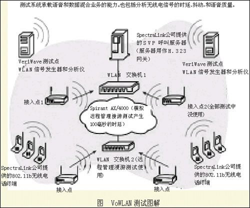 這次試驗搭建了有著自己鮮明特點的VoWLAN試驗系統(tǒng)。該系統(tǒng)包括兩個802.11b接入點適配設備和一部連接到接入點的交換機以及路由設備,還有14個WLAN手持終端設備和SpectraLink公司提供的SVP呼叫服務器(服務器用做H.323網(wǎng)關)。另外,VeriWave公司提供了實驗的測試設備。我們還在漫游測試項目中使用了由Spirent公司提供的信號損傷發(fā)生器。