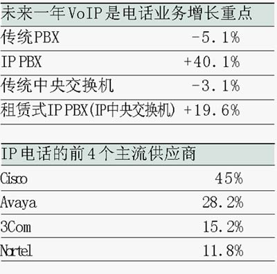 事實上,北美市場的實際銷售量已經(jīng)表明,市場中的傳統(tǒng)語音交換機(jī)銷售量已經(jīng)在明顯下降,而具備IP功能或純IP系統(tǒng)的銷售量卻在穩(wěn)步上升。Gartner 預(yù)計,2005年在北美地區(qū)銷售的純IP系統(tǒng)總價值將高達(dá)9.03億美元,比2004年的6.86億美元上升32%。同時,傳統(tǒng)電路交換系統(tǒng)的銷售量將從2004年的14億美元下降至9.99億美元,下降的幅度是32%。而混合式系統(tǒng)的銷量增長幅度可望達(dá)到30%,也就是說,從2004年的1.5億美元增長到2005年的2億美元。