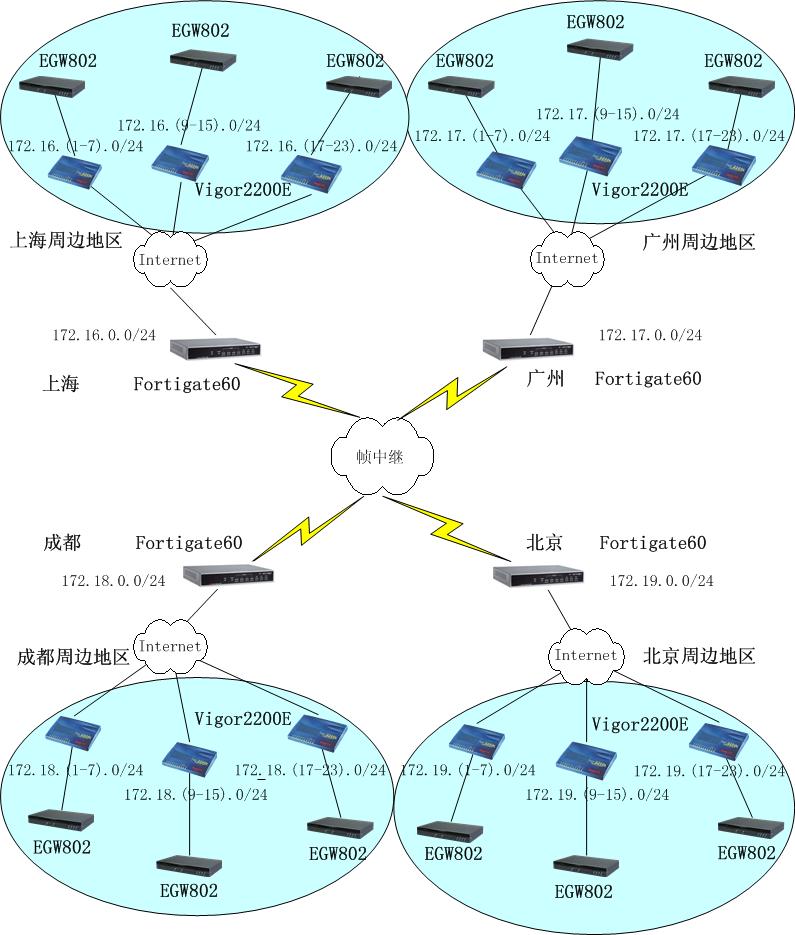 由于分部遍布全國多個省市,所以要是繼續(xù)同時使用北方網(wǎng)通與南方電信的話,那么這2個地方交換數(shù)據(jù)就會延遲很大,為此,遠成集團特地把全部分部規(guī)劃到4個分部去,這4個分部之間使用幀中繼線路連接,這樣就解決了延遲問題.